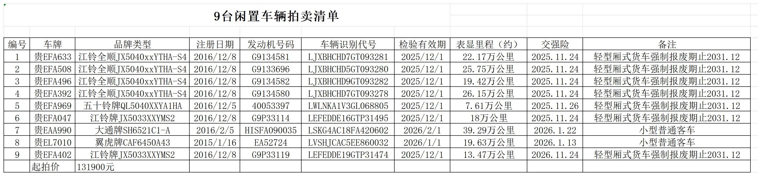 受委托,我公司定于2025年9月25日10時25分在中拍平臺(https://paimai.caa123.org.cn)對翼虎牌小型普通客車、大通牌小型普通客車、江鈴全順牌輕型廂式貨車、五十鈴牌輕型廂式貨車、江鈴牌輕型廂式貨車等舊機動車共9輛進行整體打包拍賣。